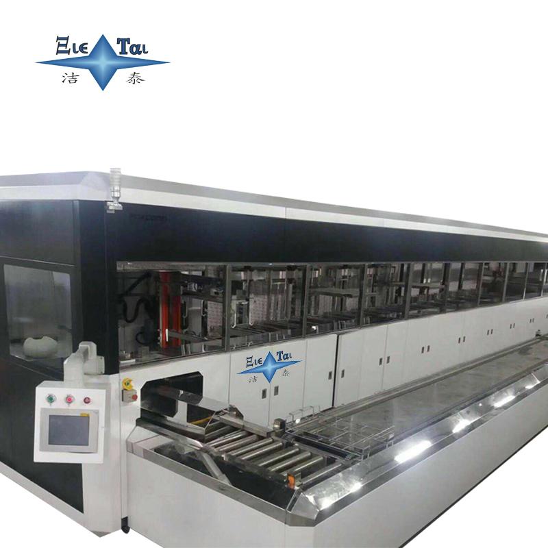 潔泰龍門臂超聲波清洗機,是一款全自動,清洗過程由微控控制,5個由SUS316材質(zhì)制作的清洗槽,漂洗槽、烘干槽組成的一條連續(xù)工作的裝置。操作者將裝有工件的清洗籃放置在進料輸送滾道上,輸送滾道將清洗籃送往上料工位,機械手依次將清洗籃送往各清洗槽,對工件進展熱浸洗、超聲粗洗、超聲精洗、蒸汽浴洗及熱風烘干,第一到五槽的熱浸洗、超聲波粗洗、超聲波精洗、蒸汽浴洗、熱風烘干過程中,清洗籃旋轉(zhuǎn)機構(gòu)使清洗藍始終處于旋轉(zhuǎn)狀態(tài),使工件充分得到清洗,提升過程中洗籃也始終處于旋轉(zhuǎn)狀態(tài),并在冷凍區(qū)停留一段時間,使清洗液脫離工件流回清洗槽,工件橫移機構(gòu)負責將工件挪動一個工位,出料輸送滾道將清洗好的工件送往出口,操作者在出口處將工件卸下,翻開洗籃將工件道入器皿,清洗既告完成。